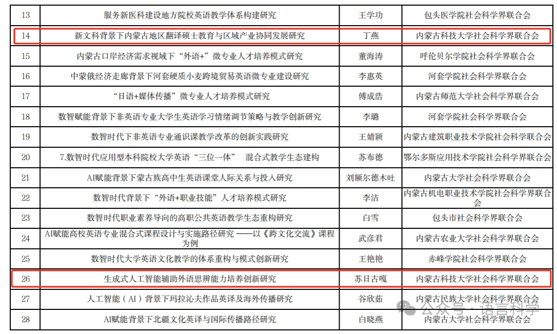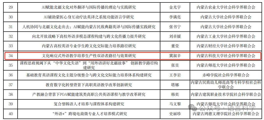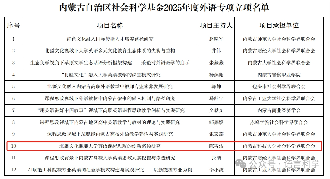 近日,内蒙古自治区社会科学基金2025年度外语专项立项名单正式公布,ladbrokes中文官网 丁燕、陈雪洁、苏日古嘎、冀淑辛四位老师的课题成功获批,这一成果标志着ladbrokes中文 在科研创新与学科建设方面迈出重要步伐。