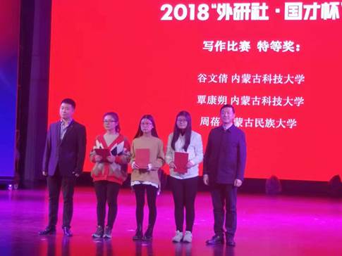 我校选手不负众望,写作组:谷文倩和覃康朔分别荣获特等奖中的冠军和亚军。阅读组:贺田田和刘涛同时荣获二等奖。演讲组:李博和茹果分别荣获二等奖和三等奖;谷文倩和茹果作为复赛特等奖选手将于201812月初代表内蒙古自治区赴北京参加“外研社•国才杯”全国大学生英语挑战赛总决赛。