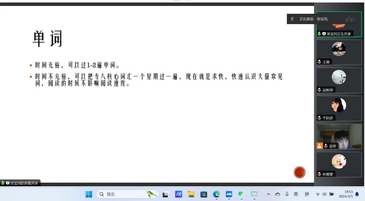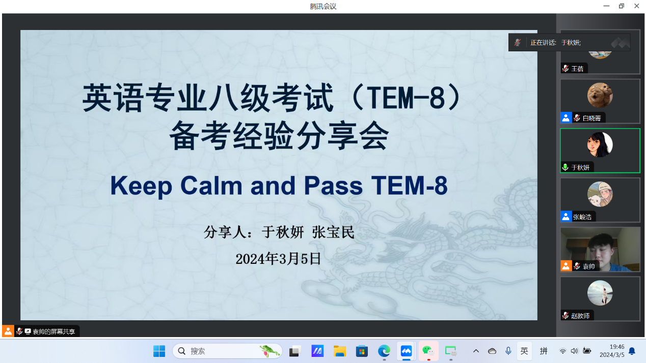 举办专八经验备考分享会时,我们请到了2022届商务英语专业毕业生于秋妍和2023届英语专业毕业生张宝明,两名同学都是当年的研究生保送学生。两名同学分别从专八考试的题型、专八单词准备及应对方法入手,详细梳理了每种题型的注意事项,强调练习的重要性,还为同学们解答了备考过程中出现的问题。