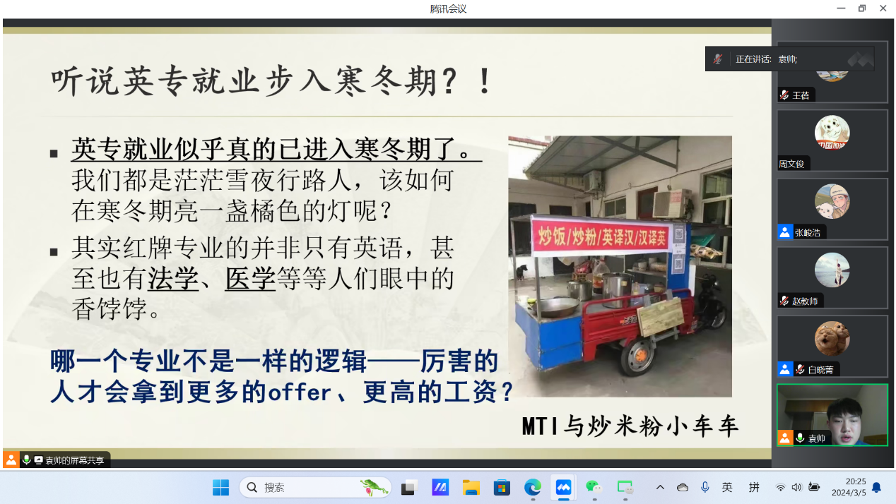 学生会主席袁帅(报送研究生)分享了自己收集到的一些英专就业方向和获得就业信息的渠道。