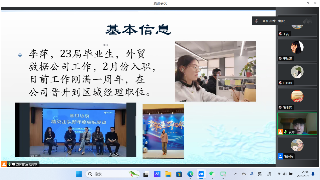 李萍从“哪些人适合外贸”、“怎样找外贸工作”、“有公司回复后问哪些重点”和“入司后该怎么做”这四个方面给同学们带来了外贸工作的经验。